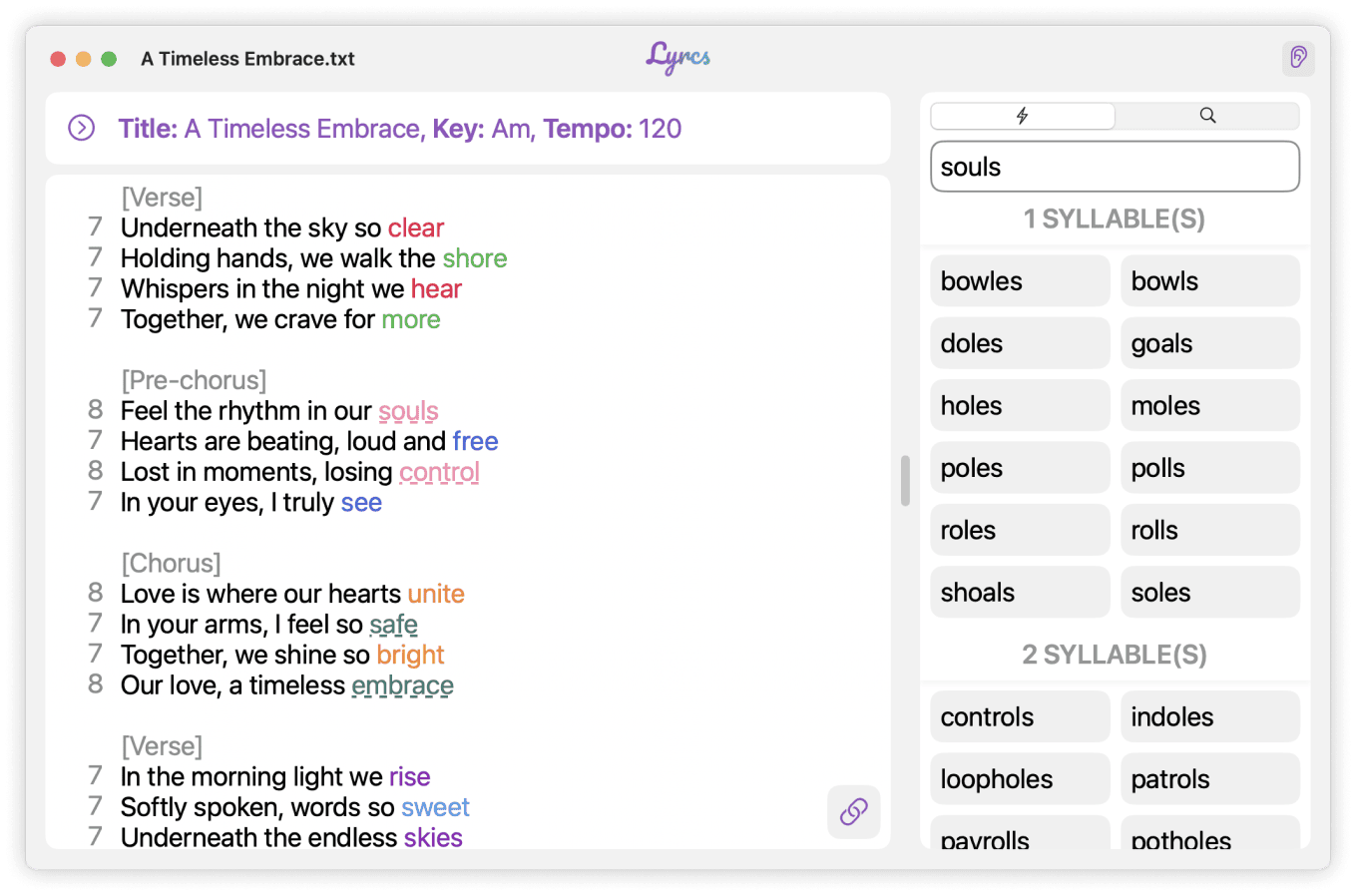 Highlights rhymes, counts syllables, accepts near rhymes, shows chords, organizes sections... and that's just the beginning.